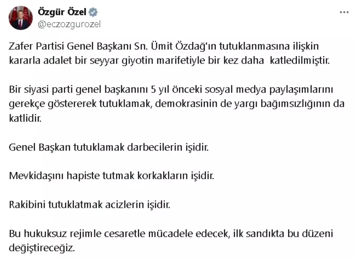 CHP Genel Başkanı Özgür Özel, Ümit Özdağ’ın Tutuklanmasını Eleştirdi